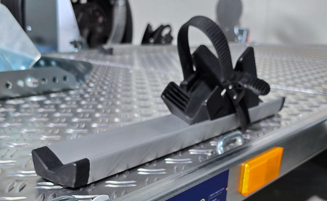 Du kannst den TREILER ebenerdig absenken und einfach mit dem Motorrad oder Fahrzeug auffahren. Die Motorradwippe hält dein Motorrad in Position.